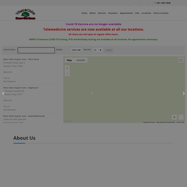 2150 Highway 6 South Houston TX ZIP 77077 281 496-4948. West Oaks Urgent Care Center. - Walk-in Medical Clinic.